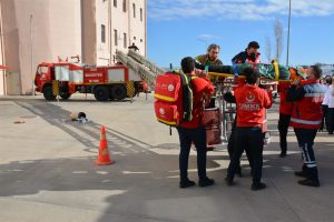 Ekiplerin, hastane binasında gerçekleştirdiği tatbikatta oluşabilecek herhangi bir acil durumda yangın söndürme, yaralıyı sedye yardımı ile tahliye etme ve mahsur kalanları kurtarma faaliyetleri canlandırdı.